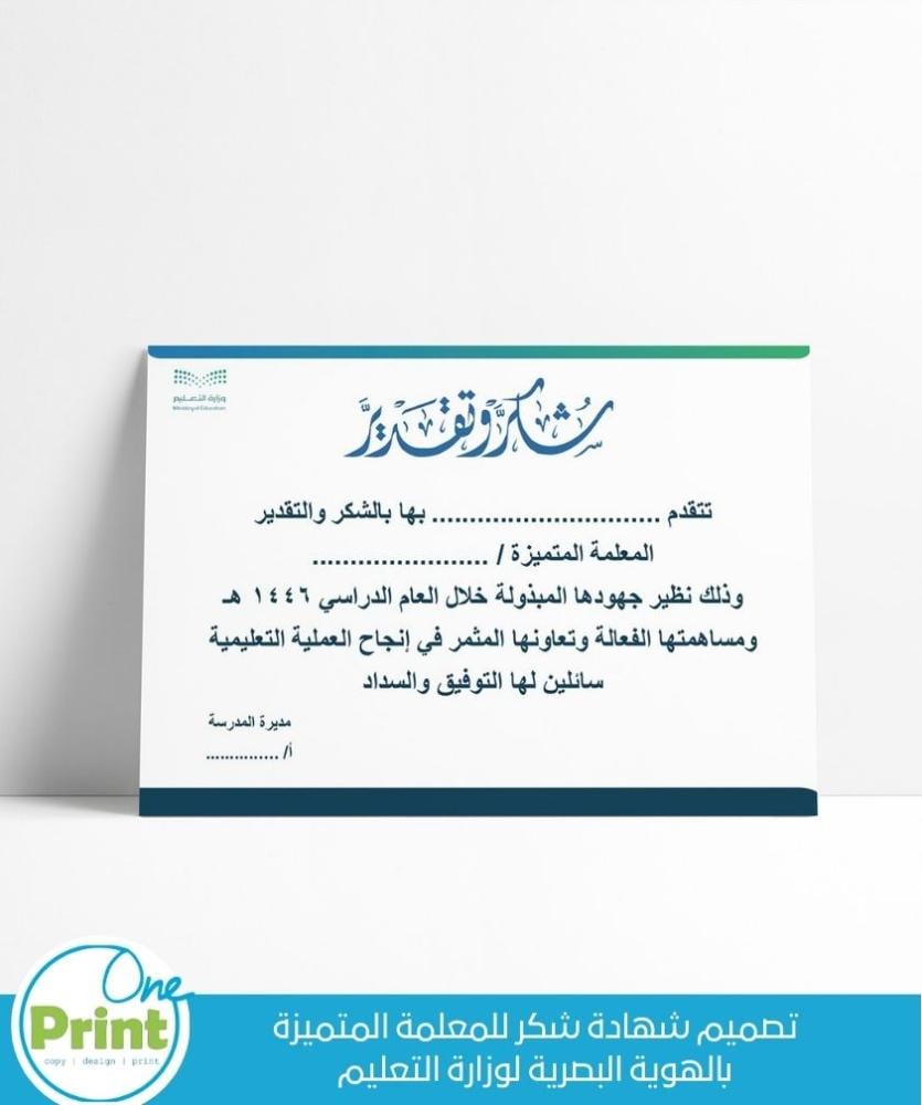 تصميم شهادة شكر للمعلمة المتميزة بالهوية البصرية لوزارة التعليم