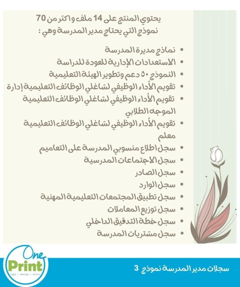 يحتوي المنتج على 14 ملف و اكثر من 70 نموذج التي يحتاج اليها مدير المدرسة وهي :نماذج مديرة المدرسةالاستعدادات الإدارية للعودة للدراسةالنموذج ٥٠ دعم وتط...